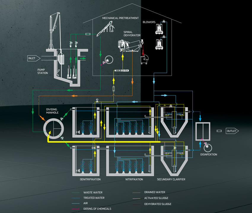 Design of devices for the waste water treatment is based on latest findings of mechanical, biological and chemical waste water treatment.
