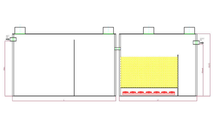 | Type of WWTP | PE | Q(m3/day) | BOD5(kg/day) | L(mm) | B(mm) | H(mm) | L1(mm) | B1(mm) | H1(mm) | Hin(mm) | Hout(mm) | DN(mm) | Power(W) | Weight(kg) |